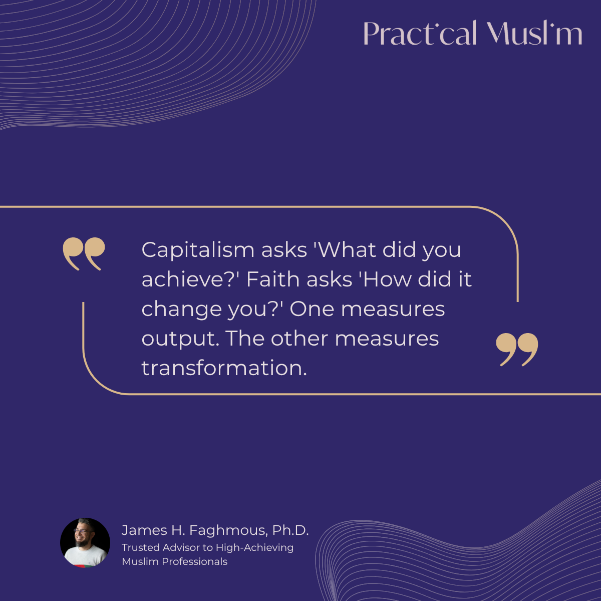 Capitalism asks 'What did you achieve?' Faith asks 'How did it change you?' One measures output. The other measures transformation.